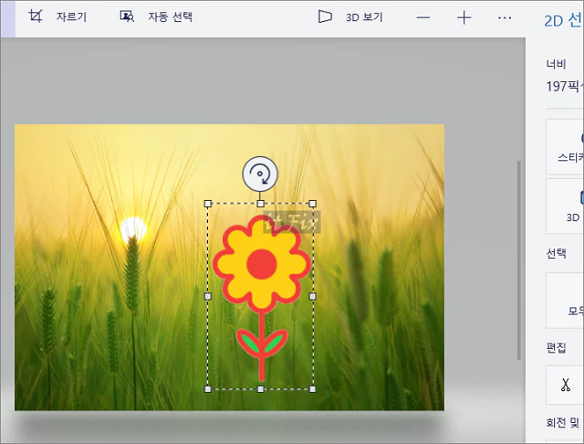 이제 다시 그림판 3D에서 아무 이미지나 불러온 다음 위의 꽃 이미지를 넣고 크기와 위치 등을 조절해 줍니다.