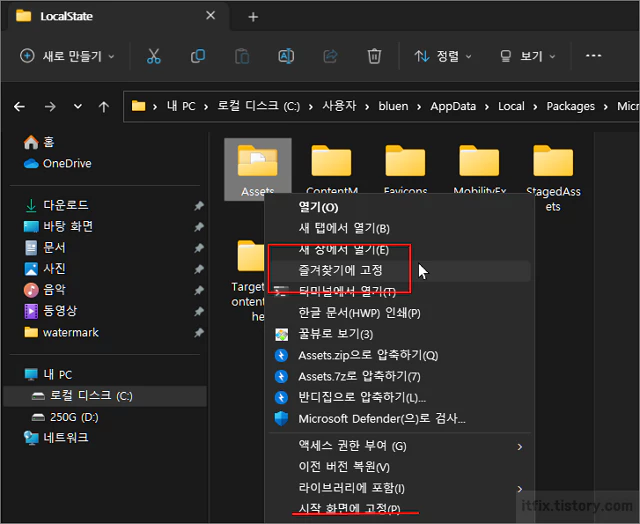 바탕화면 이미지들이 모이는 해당 폴더의 한단계 위로 이동한 다음 해당 폴더를 마우스 우클릭한 다음 즐겨 찾기에 고정을 클릭해 줍니다. 아예 윈도우 시작 버튼에 고정해 두기 위해 시작 화면에 고정을 선택할 수도 있습니다.