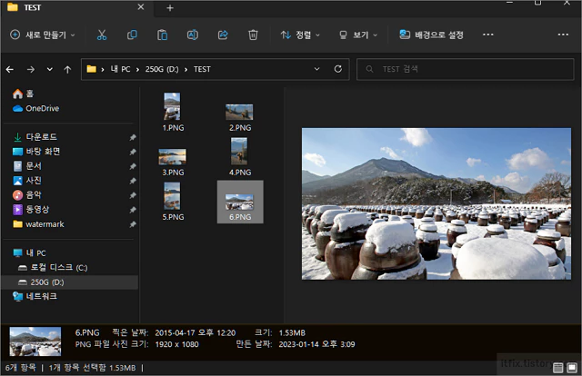 위의 이미지에 나오는 파일 탐색기 아래쪽에 이미지 파일의 상세 정보가 표시되도록 만드는 방법은 이전 포스팅을 참조해 보시기 바랍니다.