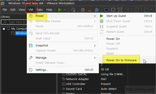 - 동일한 명령으로 이미지를 선택한 다음 상단 메뉴에서 vm > power > power on to firmware를 클릭해도 동일하게 작동합니다.