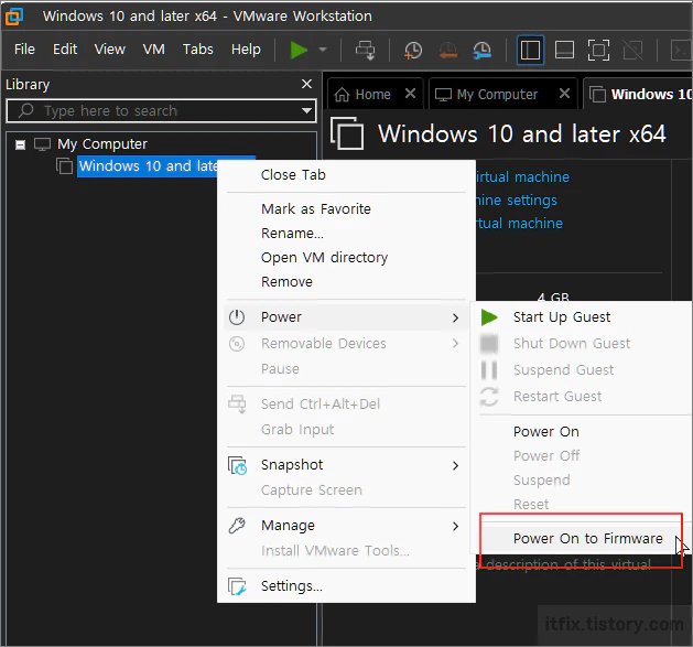 - 이미지를 선택한 다음 우클릭후 Power > Power On to Fimware를 클릭합니다.