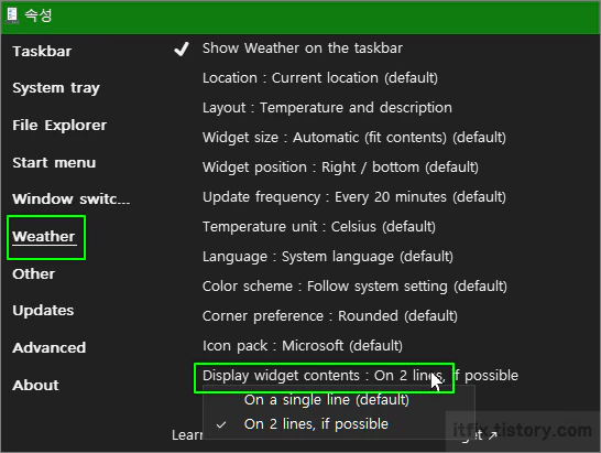 옵션 설정 창에서 중간쯤에 있는 Weather 부분을 선택하고 Display widget contents를 On 2 lines로 선택하면 위의 작업표시줄 이미지처럼 만들 수 있습니다. 날씨 정보는 20분마다 갱신됩니다.
