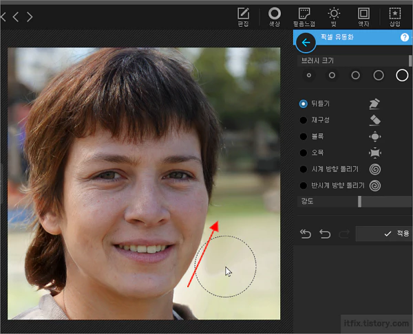 문지르기 기능을 이용해 픽셀을 왜곡시켜 원하는 보정을 만들어 내는 기능입니다.