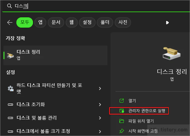 이번에도 윈도우 시작 버튼을 누르고 디스크라고 타이핑한 다음 관리자 권한의 디스크 정리를 실행합니다.