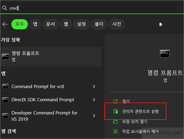 윈도우 시작 버튼을 누르고 CMD를 입력한 다음 관리자 권한의 명령 프롬프트를 실행합니다.