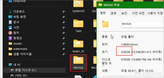보통의 경우 Winsxs 폴더는 윈도우즈 하위 폴더 중 가장 많은 용량을 차지하는 폴더로 손꼽히는 폴더입니다. 이 폴더의 정체는 과거부터 현재 시점까지의 윈도우 업데이트 기록이나 파일들을 보관하고 바이너리 파일들을 저장해 두는 시스템 폴더의 하나입니다.