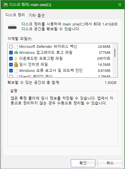정리할 드라이브로 보통 C 드라이브가 먼저 팝업 되는 데, C 드라이브를 선택해 줍니다. 극히 일부의 중요해 보이는 파일을 제외하면 거의 대부분의 항목을 정리 대상으로 체크해도 무관합니다.