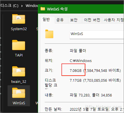 보통 WinSxS 폴더를 정리하는 이유는 공간 부족 문제를 해결하기 위한 경우가 대부분입니다. 따라서 WinSxS 정리를 진행했다면 시스템 정리 작업도 같이 해주는 것이 보통인데 이 작업 이후의 WinSxS 폴더 크기에 변화가 있는지 관찰해 보았습니다.