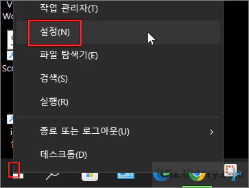 작업 표시줄의 좌측 끝에 있는 윈도우 시작 버튼을 마우스 우클릭 후 설정(N)을 클릭합니다.