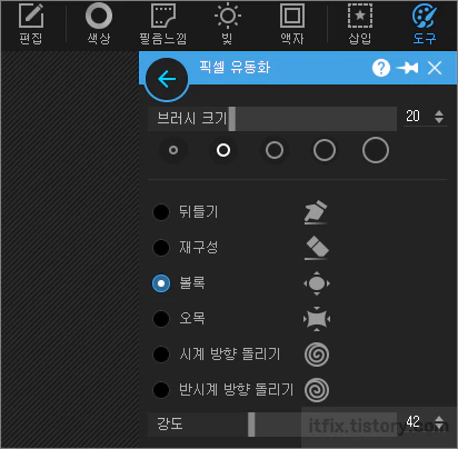 이번에는 픽셀 유동화의 볼록을 선택하고 브러시 크기를 이미지 크기가 작으므로 적당하게 대략 20 정도로 지정해 주면 됩니다.