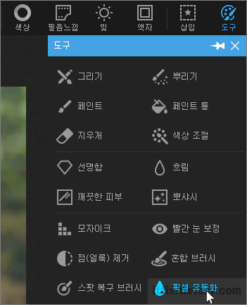 포토스케이프 X 편집화면 상단 메뉴에서 도구 > 픽셀 유동화를 선택합니다.