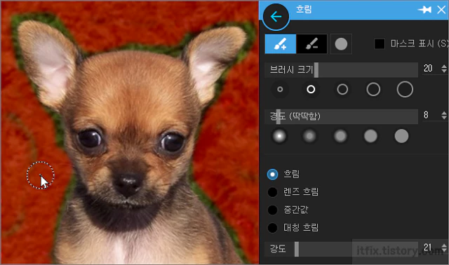 브러시 크기를 조절해 가면서 이미지 크기를 확대해 칠 작업을 하면 흐려지는 부위를 보면서 작업할 수 있습니다.
