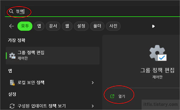 그룹 정책 편집기를 열고 토스트 알림 설정에서 토스트 알림 기능이 차단되어 있는지 살펴보고 차단 중이라면 이를 해제합니다. 그룹 정책 편집기를 열려면 윈도우 시작 버튼을 누르고 정책이라고 타이핑한 다음 그룹 정책 편집 열기를 클릭합니다.