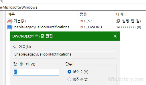 DWORD 값의 이름은 EnableLegacyBalloonNotifications 라고 지어준 다음 값은 1로 지정해 줍니다. 다만, 이 기능은 토스트 팝업 기능을 정지시키는 대신 이전 윈도우의 풍선 도움말 형식을 부활시키는 명령이므로 엄밀히 말하면 기능 정지는 아닙니다. 그러므로 이 값을 0으로 지정해 줄 경우에 토스트 알림을 다시 활성화시키는 명령이므로 값은 0이 되어야 합니다.