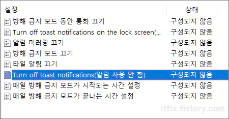 알림 폴더 내부의 내용중 Turn off toast notifications(알림 사용 안 함)을 더블 클릭해 사용으로 되어 있다면 구성되지 않음 또는 사용 안 함으로 변경해 줍니다.
