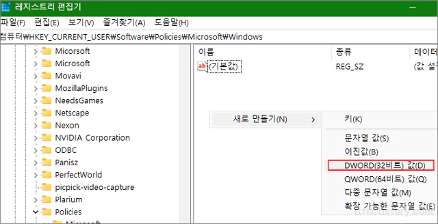 오른쪽 항목에서 마우스 우클릭 후 새로운 DWORD(32비트) 값(D)을 클릭합니다.
