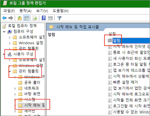 그룹 정책 편집기가 열리면 사용자 구성 > 관리 템플릿 > 시작 메뉴 및 작업 표시줄을 선택한 다음 우측에서 알림 폴더를 선택해 알림 폴더 내부로 진입합니다.