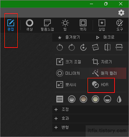 이전의 조정 메뉴의 하위에 있는 역광보정 기능은 다소 찾아가기 어려운 반면 HDR 기능 버튼은 편집 메뉴에서 하부 메인 메뉴에 존재하므로 쉽게 찾아서 바로 이미지에 적용시키고 사용할 수 있습니다.