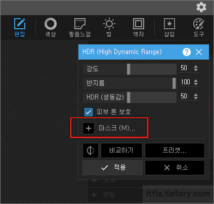 HDR 기능을 켠 다음 마스크를 클릭하면 전체적인 HDR 적용이 아닌 원하는 부분만 HDR을 적용시킬 수 있습니다.