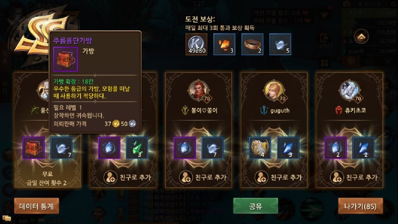 모험던전 빵녹이는 중에 한파티에서 계승에 18칸 가방까지 한꺼번에 나오는 날도 있네요.
