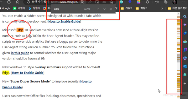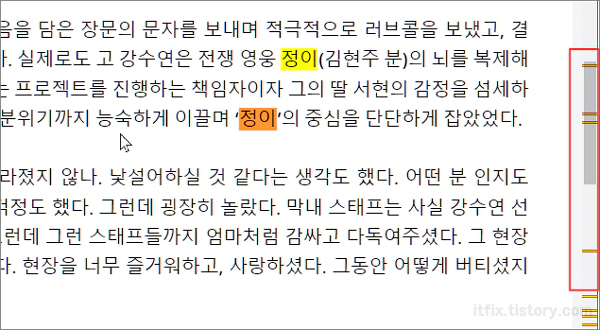 또한, 우측의 스크롤 바 부분에는 회색으로 현재 페이지에서 해당 검색 단어들의 위치를 눈금으로 표시해 주고 있습니다.
