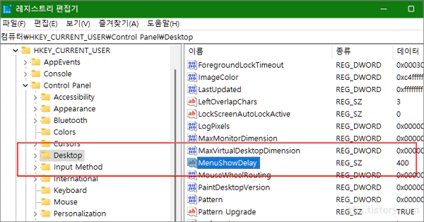 우측의 여러가지 값들 중 MenuShowDelay 값을 찾습니다. 이 값이 0이면 애니메이션 효과가 없는 상태이며, 400이면 애니메이션 효과가 활성화된 상태입니다.