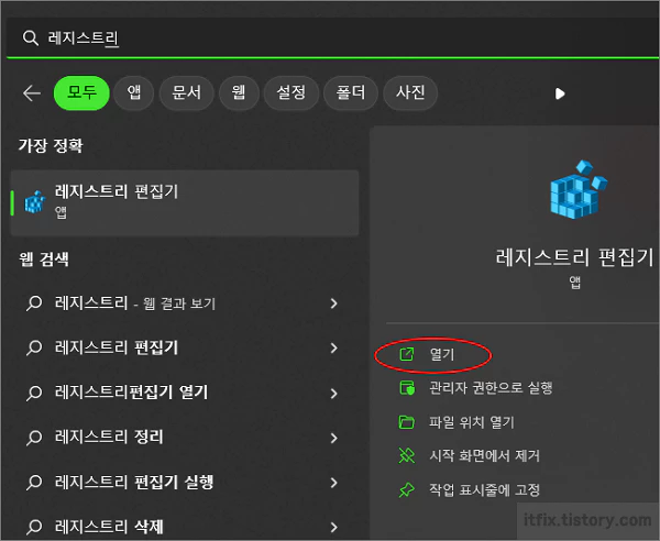 1. 윈도우 시작 버튼을 누르고 레지스트리를 입력하여 레지스트리 편집기를 실행합니다.