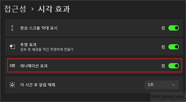 창 애니메이션 효과를 끄거나 키는 설정은 윈도우 설정 > 접근성 > 시각 효과 항목에서 설정할 수 있습니다.