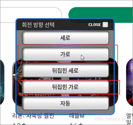 회전 제어 앱을 실행하고 가로 모드 또는 뒤집힌 가로 모드를 한번 클릭해 준 다음 데스가르드 게임 창으로 돌아오면 설정이 적용됩니다.