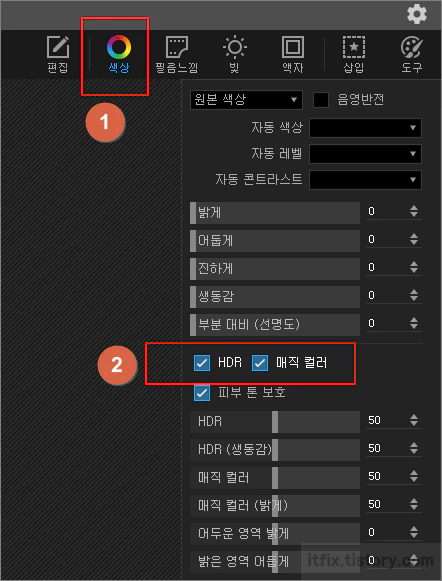 사진의 색감을 더하고 좀 더 밝고 뽀샤시한 사진으로 바꾸고자 할 경우 색상 메뉴의 HDR+매직 컬러 메뉴를 이용하면 됩니다. 사용 방법은 매우 간단해서 상단 메뉴의 색상을 클릭하고 중간의 HDR 및 매직 컬러를 모두 체크해 주고 적용하면 끝입니다. 물론, 좀 더 능숙해지면 그 하위 메뉴를 조절해서 좀 더 향상된 보정 결과물을 만들어 낼 수도 있습니다.