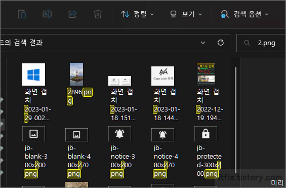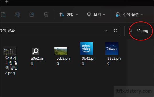 그렇다고 해서 만능문자가 필요 없는 것은 아니고 2가 들어간 파일명 중에서도 가장 끝에 2가 들어간 png 파일만 찾고자 할 경우에는 *2.png처럼 검색하면 됩니다.