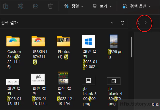 하지만 현재의 윈도우는 훨씬 쉽게 사용하도록 되어 있어 그냥 2만 우측 상단의 검색상자에 입력하면 2가 들어간 모든 파일을 현재 위치한 폴더 위치에서 찾습니다.