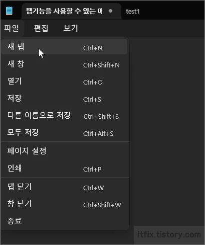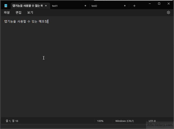 업데이트가 끝난 뒤의 메모장은 아래의 모습처럼 탭기능을 사용할 수 있는 메모장을 볼 수 있습니다. 새 창 열기를 새 탭으로 할지 또는 새 창으로 할지는 메모장의 설정에서 지정할 수 있습니다.