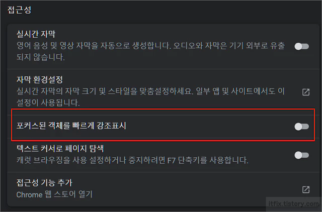 크롬 브라우저의 경우에 설정 > 접근성 항목에서 '포커스 된 객체를 빠르게 강조표시'라는 항목을 꺼주시면 됩니다.
