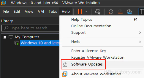 이미지 로딩에는 실패하지만 vmware 시작에는 문제가 없다면 vmware 시작 이후 상단 메뉴 중 Help > Software Updates를 클릭합니다.