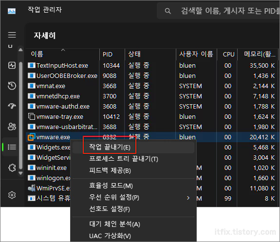작업 관리자에서 실행 프로세서 목록 중 vmware.exe를 마우스 우클릭 후 작업 끝내기를 선택해 줍니다. 이렇게 하면 구버전의 vmware가 종료되면서 vmware의 자동 업데이트를 계속해서 진행할 수 있습니다.