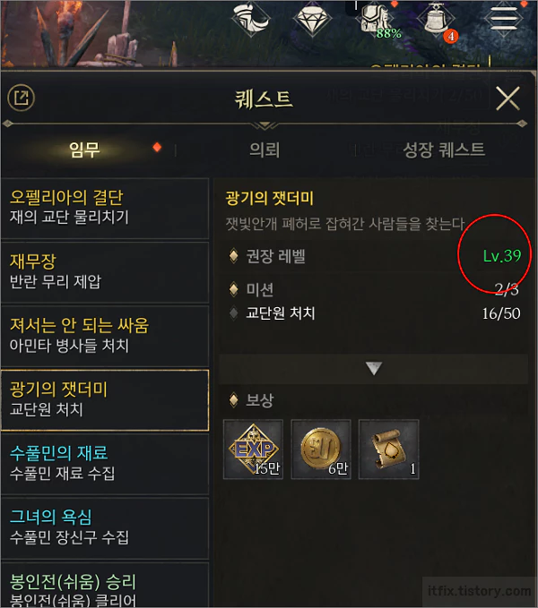 모든 전기를 다 열게 되면 하나를 밀다 막힐 경우 그다음으로 뭘 밀어야 할지 헷갈릴 수 있습니다. 이런 경우에는 메뉴 > 퀘스트를 누른 다음 진행 중인 4개의 전기 퀘스트를 클릭해 보고 수행 레벨 수준이 가장 낮은 전기 쪽을 밀면 됩니다.