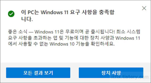 검사 후 '이 PC는 윈도우 11 요구 사항을 충족합니다.'라는 메시지를 볼 수 있다면 해당 PC는 윈도우 11 설치에 문제가 없는 PC입니다.