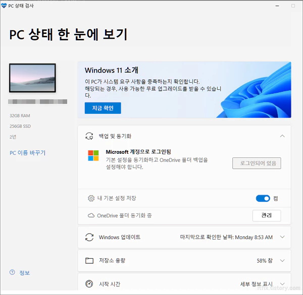아래의 이미지는 이미 윈도우 11이 설치된 PC에서 PC 검사 앱을 실행했기 때문에 이러한 이미지의 모습을 가지고 있지만 윈도우 11 설치 전이라면 하드웨어 사양이 윈도우 11 설치에 적합한지 검사한 다음 그 결과창을 출력해 줍니다.