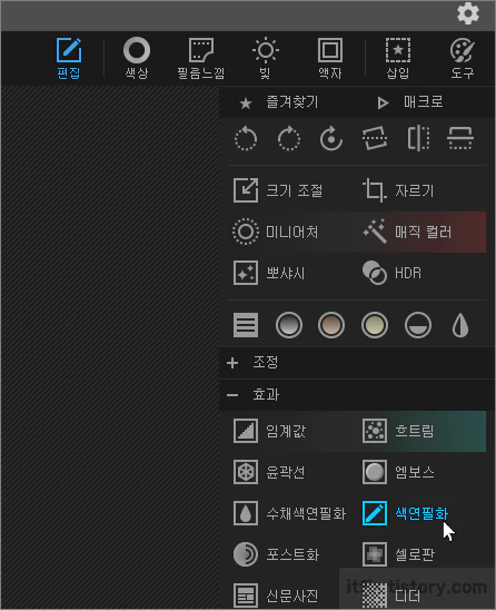 그다음 우측에 있는 메뉴에서 효과 > 색연필화를 클릭합니다.