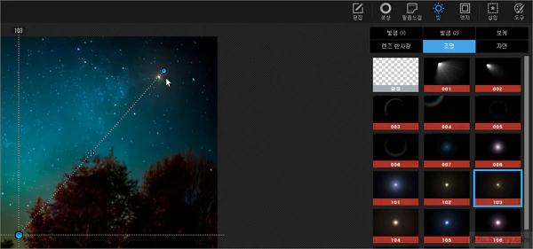 여기서 렌즈 반사광의 경우에는 잔상이 생기므로 주간의 태양광 등에 적합하고 잔상이 없는 별빛 효과에는 조명 효과가 더 적당합니다. 여기서는 조명 103번 모델을 사용하고 스케일은 12로 조정해 주었습니다.
