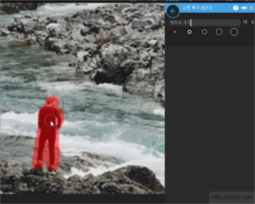 그다음 칠하기 좋게 적당한 브러시 크기로 줄여주고 대충 없애야 할 사람 부분을 문질러 줍니다. 만일, 마우스를 뗏을때 잔상이 조금 남는 다면 잔상 부분만 동일하게 한번 더 칠해주면 됩니다.