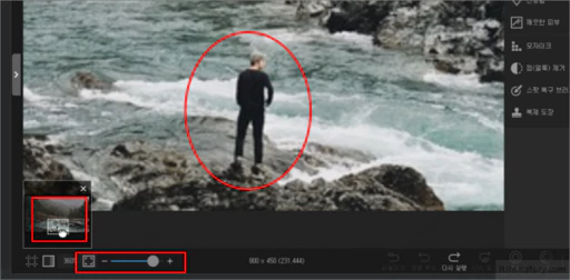 배율을 확대한 다음 바로 위쪽의 조그만 사각형 팝업 창 내부의 사각형을 클릭하고 이리저리 드래그하면 이미지의 편집 화면 위치를 이동시키면서 조정할 수 있습니다.