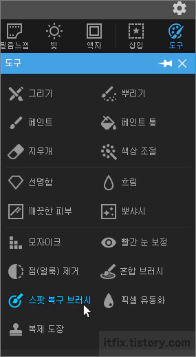 스팟 복구 브러시는 상단 메뉴 중 도구 > 스팟 복구 브러시를 클릭해 사용할 수 있습니다.