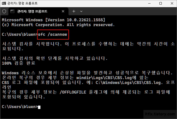 시스템 파일 검사를 시작하게 되고, 누락되거나 손상된 윈도우 시스템 파일 발견 시 이를 자동으로 복구합니다.