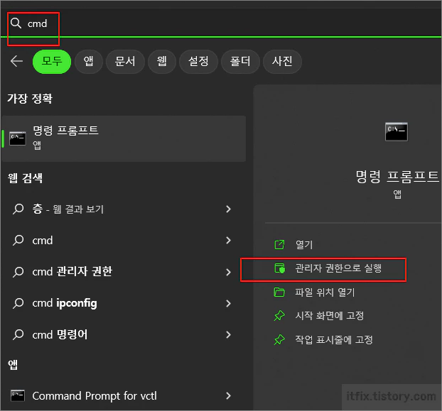 윈도우 작업 표시줄의 시작 버튼을 누르고 CMD라고 입력한 다음 관리자 권한으로 명령 프롬프트를 실행합니다.