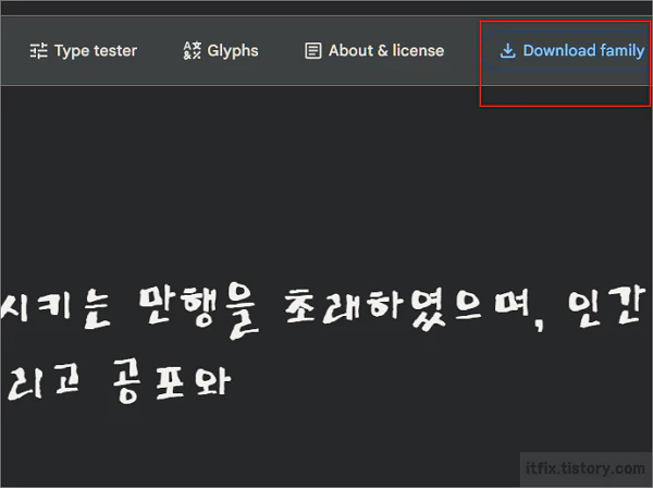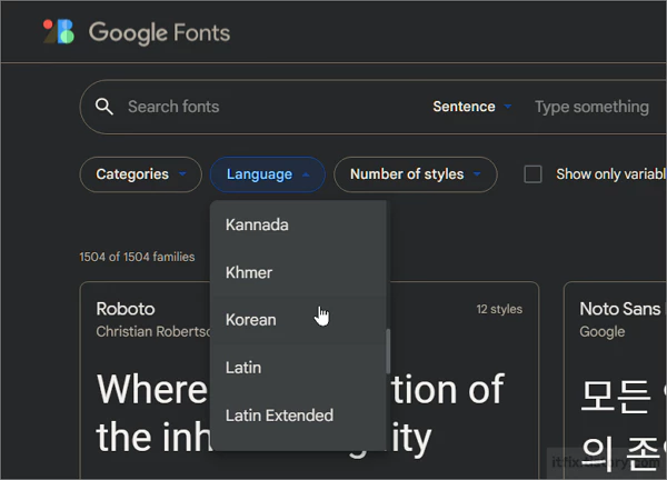 구글 무료 폰트 페이지로 이동한 다음 언어를 Korean으로 설정한 다음 나오는 한글 폰트들중 마음에 드는 폰트를 다운로드하면 됩니다.
