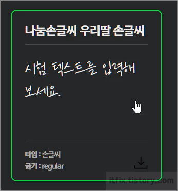 테스트를 위해 클로바 나눔손글씨 카테고리에 있는 우리 딸 손글시 폰트를 다운로드해 설치해 보았습니다. 설치 방법은 구글 폰트에서와 유사하며, 우측 하단의 다운로드 표시를 눌러 폰트를 내려받은 다음 TTF 파일을 마우스 우클릭한 다음 설치하면 됩니다.