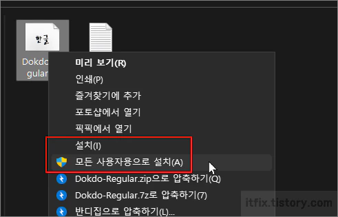 해당 파일을 우클릭한 다음 '모든 사용자용으로 설치' 또는 '설치'를 클릭합니다. 개인이 사용하는 PC라면 모든 사용자용으로 설치해 두는 것이 좋습니다.