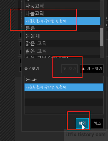 텍스트 폰트 선택 시 dokdo, 우리 딸 손글씨 폰트를 찾으면 되는데, 폰트가 선택된 상태에서 즐겨 찾기에 추가하기를 눌러두면 다음에 사용할 때 바로 해당 폰트를 사용하기 편리합니다.